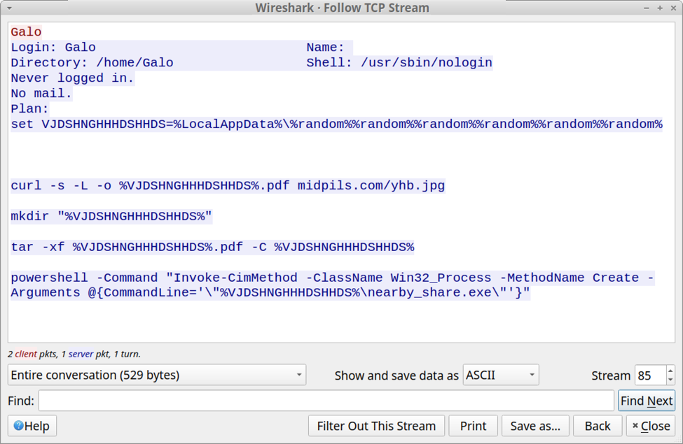 Following the TCP stream of this traffic revealed text returned from the server. The result was a powershell command with Base64 encoded text.