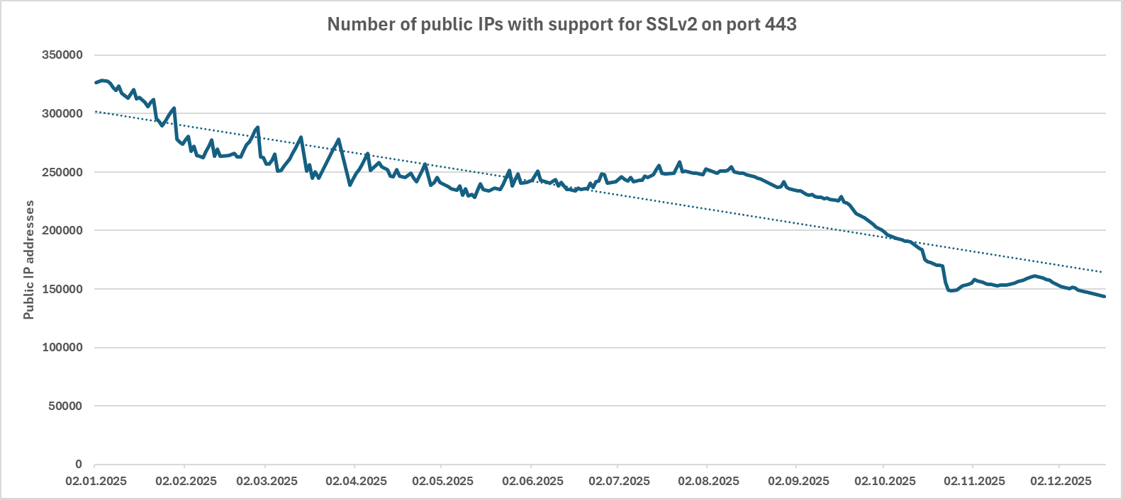 The situation has similarly improved in terms of public IP addresses exposing web servers that still support SSLv2. In January, there were more than 320 thousand such servers, while now only about 145 thousand of them seem to remain in December (unsurprisingly, a significant percentage of these servers seem to be located in Kazakhstan, which is something we’ve discussed previously[1]).