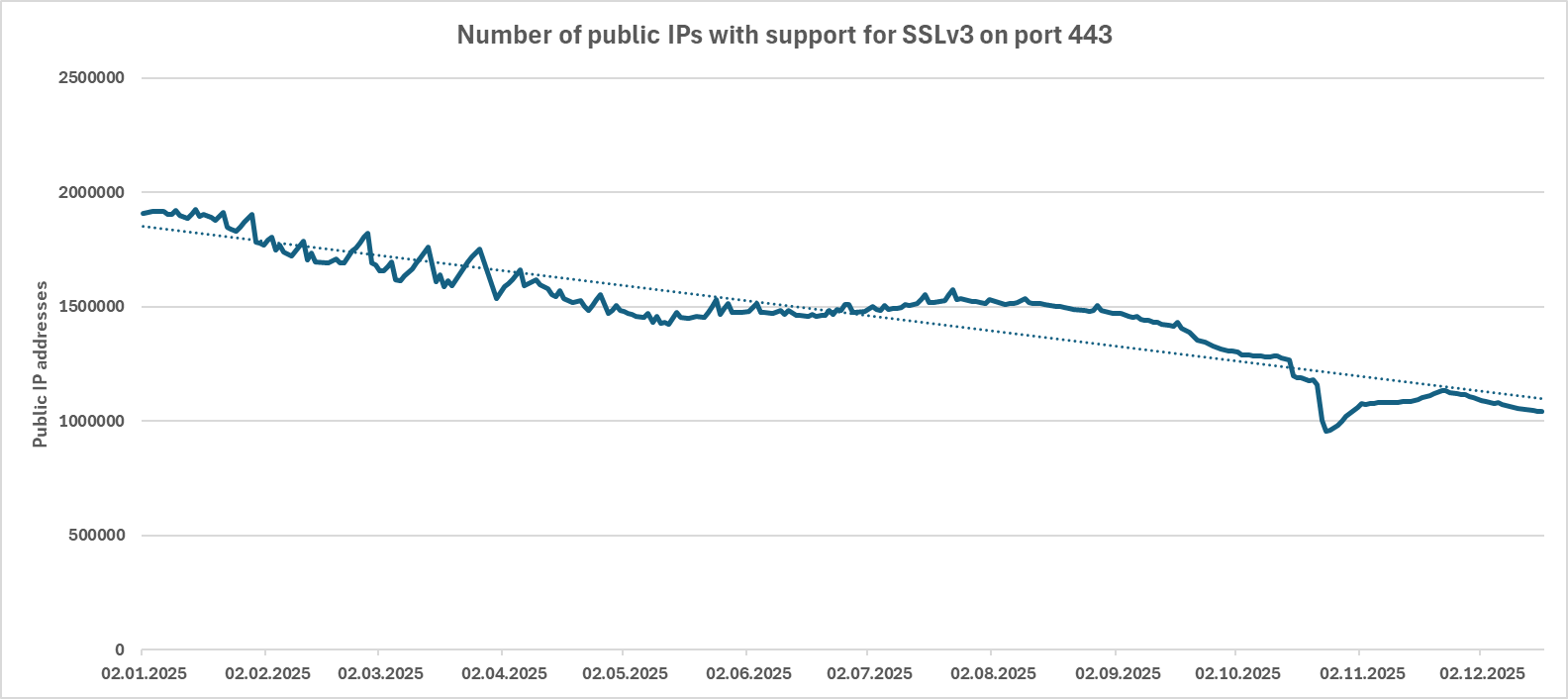 While, at the beginning of the year, there were almost 2 million web servers that supported SSLv3, at the time of writing there seem to be only a little more than 1 million of them still left on the public internet.