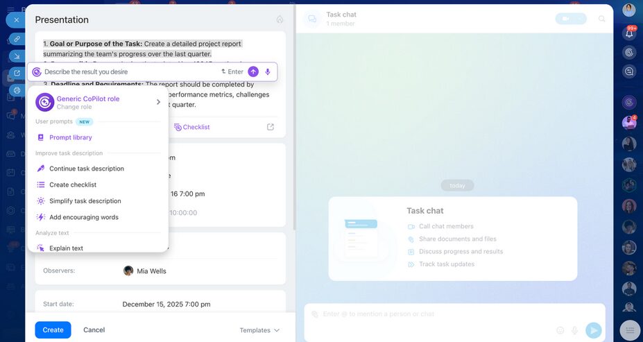 Bitrix24 AI is not an add-on; it is a Full-Lifecycle AI Project Management Platform. It’s woven across planning, communication, execution, and reporting, acting as an intelligent partner for every team member.